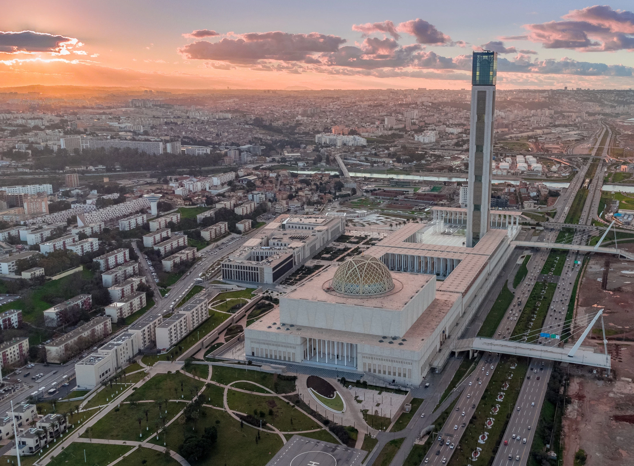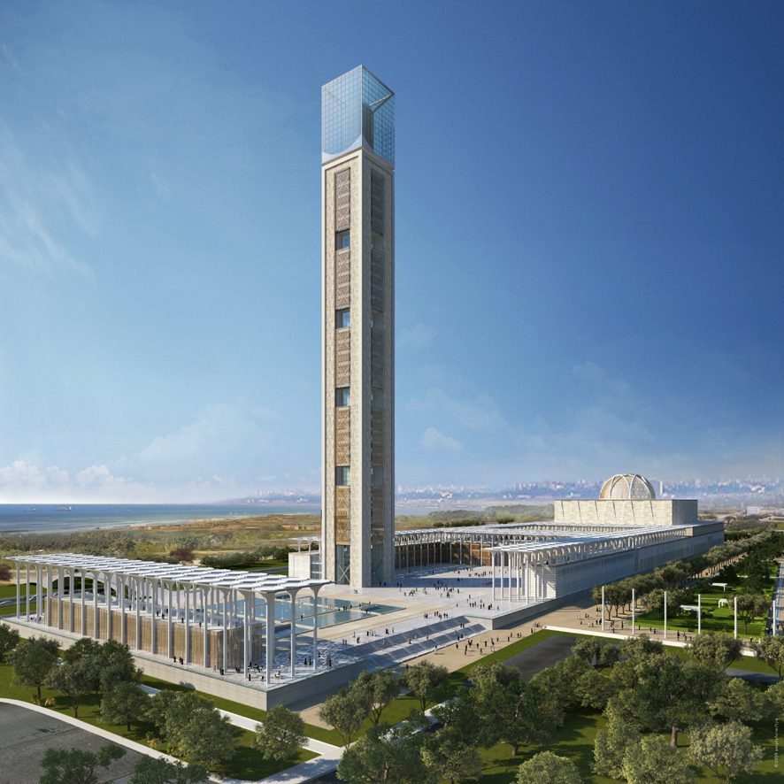 Construction of the religious and cultural complex that houses the Grand Mosque of Algiers. The complex was completed in late 2019.
